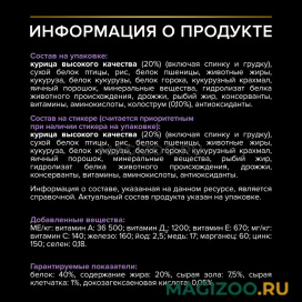 Состав товара:Курица высокого качества (20%) (включая спинку и грудку), сухой белок птицы, рис, белок пшеницы, животные жиры, кукуруза, белок кукурузы, белок гороха, кукурузный крахмал, яичный порошок, минеральные вещества, гидролизат белка животного происхождения, дрожжи, рыбий жир, консерванты, витамины, аминокислоты, колострум (0,10%), антиоксиданты.