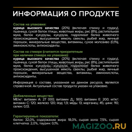 Состав товара:Курица высокого качества (20%) (включая спинку и грудку), пшеница, сухой белок птицы, животные жиры, рис (8%), растительная мука, белок кукурузы, кукуруза, гидролизат белка животного происхождения, высушенная мякоть свеклы, рыбий жир, яичный порошок, минеральные вещества, витамины, сухое молозиво (0,1%), аминокислоты, антиоксиданты.