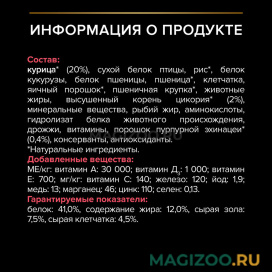 Состав товара:Курица* (20%), сухой белок птицы, рис*, белок кукурузы, белок пшеницы, пшеница*, клетчатка, яичный порошок*, пшеничная крупка*, животные жиры, высушенный корень цикория* (2%), минеральные вещества, рыбий жир, аминокислоты, гидролизат белка животного происхождения, дрожжи, витамины, порошок пурпурной эхинацеи* (0.4%), консерванты, антиоксиданты.