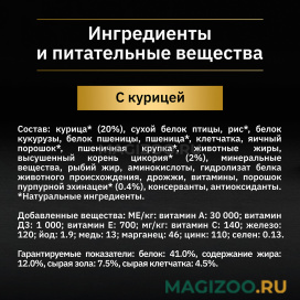 Состав товара:Курица* (20%), сухой белок птицы, рис*, белок кукурузы, белок пшеницы, пшеница*, клетчатка, яичный порошок*, пшеничная крупка*, животные жиры, высушенный корень цикория* (2%), минеральные вещества, рыбий жир, аминокислоты, гидролизат белка животного происхождения, дрожжи, витамины, порошок пурпурной эхинацеи* (0.4%), консерванты, антиоксиданты.