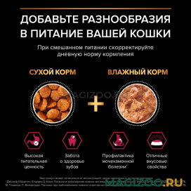Рекомендации по кормлению:Комбинируйте влажные и сухие корма PRO PLAN® с разными вкусами и текстурами для поддержания оптимального водного баланса организма и разнообразия повседневного рациона питомца.