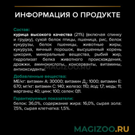 Состав товара:Курица высокого качества (21%) (включая спинку и грудку), сухой белок птицы, пшеница, рис, белок кукурузы, белок пшеницы, животные жиры, кукуруза, яичный порошок, высушенный корень цикория, минеральные вещества, рыбий жир, гидролизат белка животного происхождения, дрожжи, аминокислоты, консерванты, витамины, антиоксиданты.