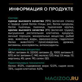 Состав товара:курица высокого качества (19%) (включая спинку и грудку), сухой белок птицы, рис, белок кукурузы, белок пшеницы, пшеница, пшеничная крупка, кролик высокого качества (4%) (включая грудку), высушенная растительная клетчатка, кукуруза, яичный порошок, минеральные вещества, рыбий жир, животные жиры, аминокислоты, гидролизат белка животного происхождения, дрожжи, витамины, консерванты, антиоксиданты.