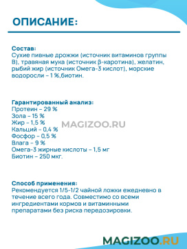 Сухие пивные дрожжи (источник витаминов группы В), травяная мука (источник β-каротина), желатин, рыбий жир (источник Омега-3 кислот), морские водоросли – 1 %,биотин.