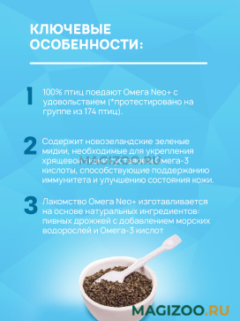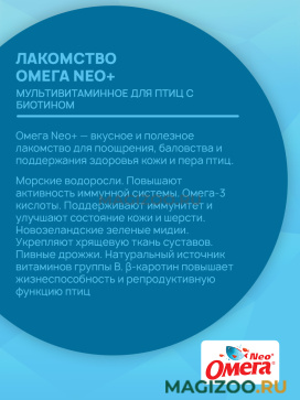 Омега Neo+ — вкусное и полезное лакомство для поощрения, баловства и поддержания здоровья кожи и пера птиц.