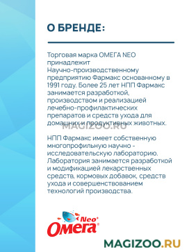 Торговая марка ОМЕГА NEO принадлежит Научно-производственному предприятию Фармакс основанному в 1991 году. Более 25 лет НПП Фармакс занимается разработкой, производством и реализацией лечебно-профилактических препаратов и средств ухода для домашних и продуктивных животных.