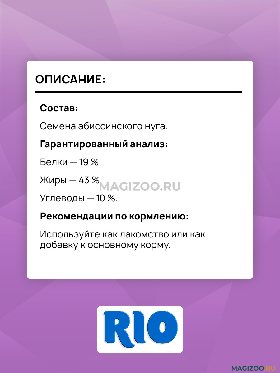 Информация о составе и ингредиентах, цветовом решении, технических и иных характеристиках, стране-изготовителе, внешнем виде и комплекте поставки товара носит справочный характер и основана на последних доступных к моменту публикации сведениях. Доставка данного товара осуществляется во все регионы РФ.Продукция бренда RIO – это 100% натуральные продукты питания и товары для ухода за птицами, которые разработаны с учетом индивидуальных особенностей, пищевых потребностей и вкусовых предпочтений пернатых питомцев. В состав продуктов RIO входят самые лучшие зерна, семена, фрукты, орехи, овощи и редкие плоды.