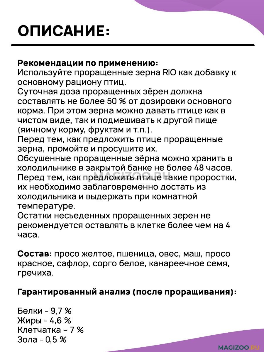 Набор для проращивания RIO – это дополнительный корм для всех видов декоративных птиц.