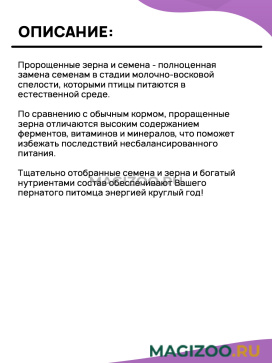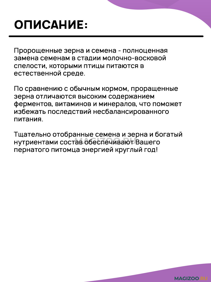 Пророщенные зерна и семена - полноценная замена семенам в стадии молочно-восковой спелости, которыми птицы питаются в естественной среде.