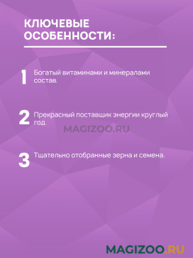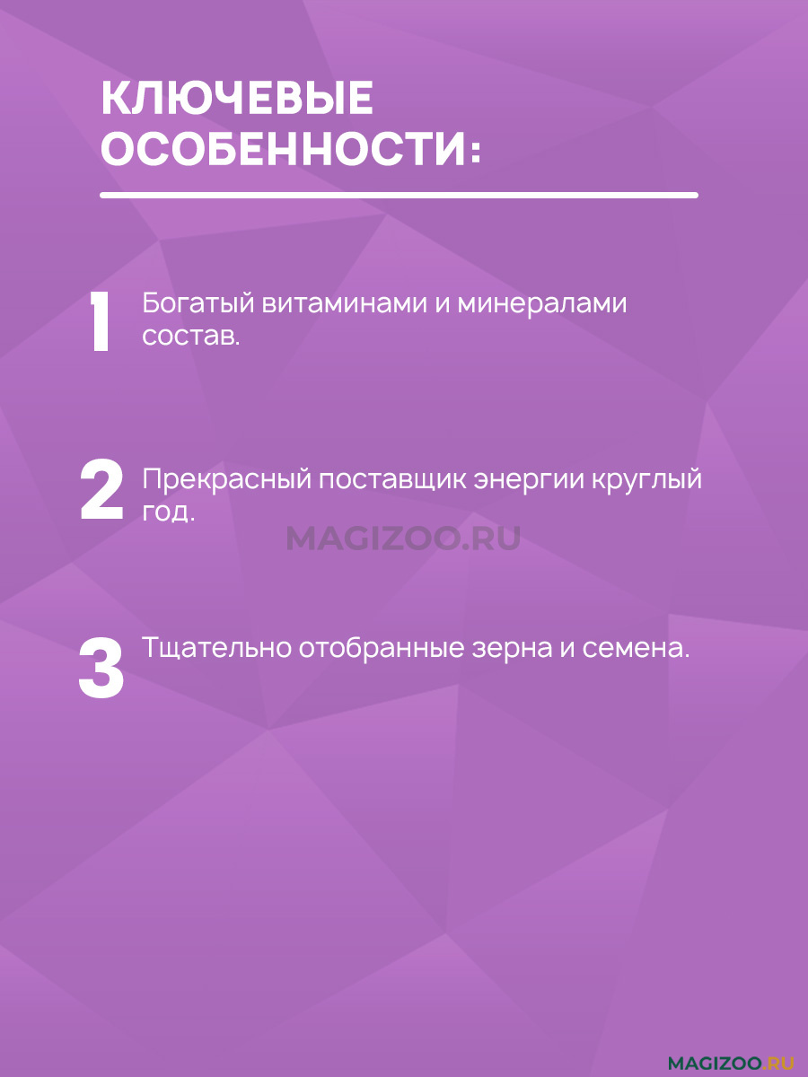 Тщательно отобранные семена и зерна и богатый нутриентами состав обеспечивают Вашего пернатого питомца энергией круглый год!