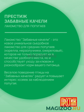 Лакомство "Забавные качели" - это новое уникальное съедобное лакомство для средних попугаев (корелла, неразлучники, ожереловый), которое не только порадует их в качестве удобного места, но и способствует уходу за клювом и разнообразит корм вашего питомца.