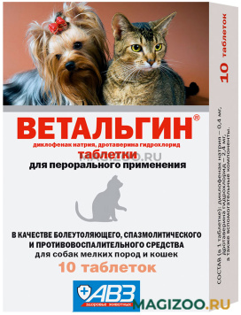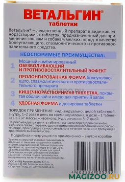 Ветальгин применяют животным индивидуально, целой таблеткой, перорально 1–2 раза в день во время кормления в дозе: таблетки для мелких пород собак и кошек – 1 таблетка на 2 кг массы животного. Запрещается делить таблетки на части перед применением. Курс лечения 5–7 дней.