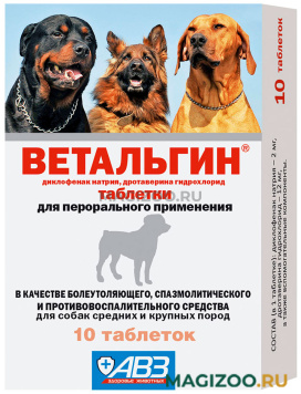Ветальгин назначают собакам и кошкам самостоятельно или в комплексной терапии при воспалительных дегенеративных заболеваниях суставов и позвоночника (ревматоидном артрите, артрозах, остеоартритах, спондилоартрозах), невралгиях, невритах, бурситах, синовитах, тенденитах, тендосиновитах, ушибах, растяжении связок, мышц и сухожилий, воспалительных отеках мягких тканей, посттравматических и послеоперационных болевых синдромах, спазмах гладкой мускулатуры при заболеваниях мочевыводящей системы и желудочно-кишечного тракта.