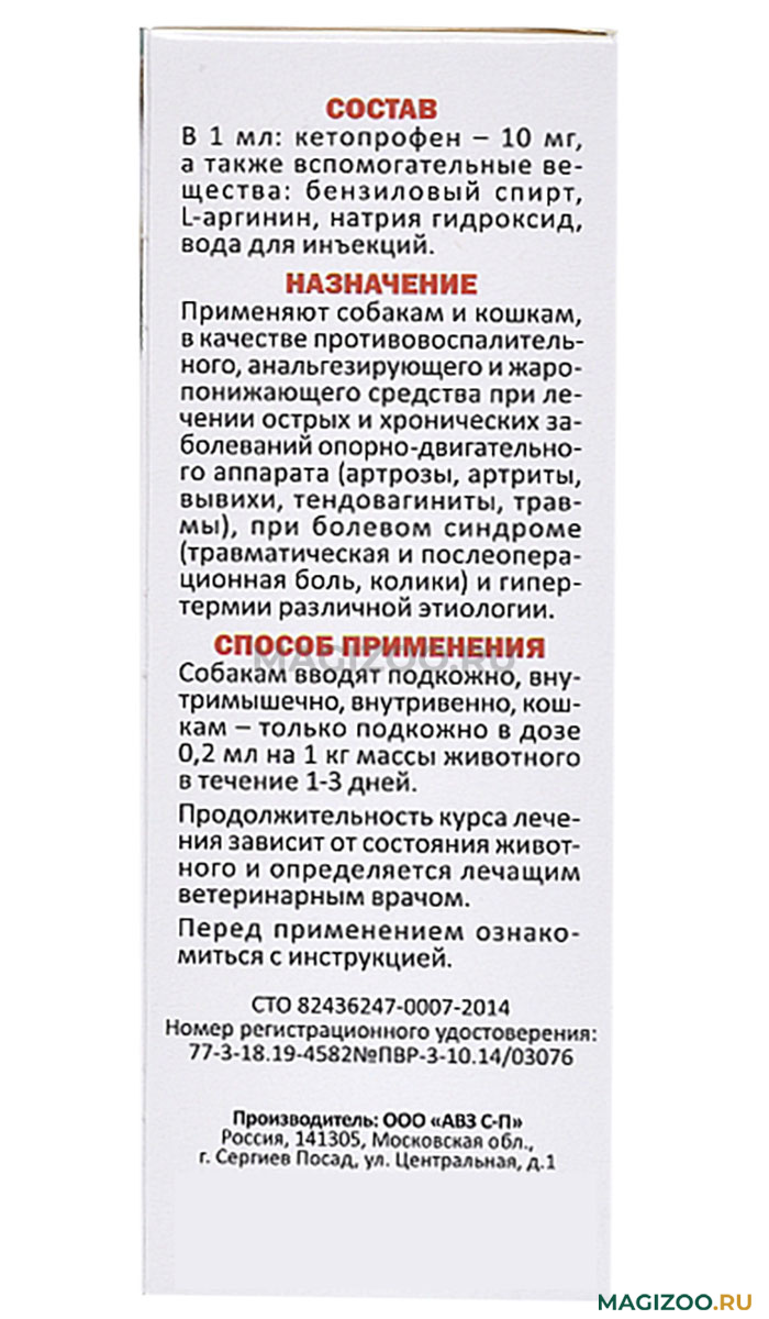Противовоспалительное, анальгезирующее и жаропонижающее средство для собак и кошек для лечения острых и хронических заболеваний опорно-двигательного аппарата, при болевом синдроме и гипертермии различной этиологии.