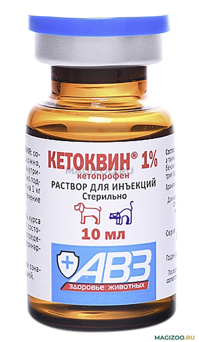 Кетоквин 1% назначают собакам и кошкам в качестве противовоспалительного, анальгезирующего и жаропонижающего средства при лечении острых и хронических заболеваний опорно-двигательного аппарата (артрозы, артриты, вывихи, тендовагиниты, травмы), при болевом синдроме (травматическая и послеоперационная боль, колики) и гипертермии различной этиологии.