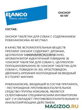 - Онсиор таблетки для собак в 4 дозировках с содержанием робенакоксиба: 5 мг/табл., 10 мг/табл., 20 мг/табл. или 40 мг/табл.