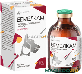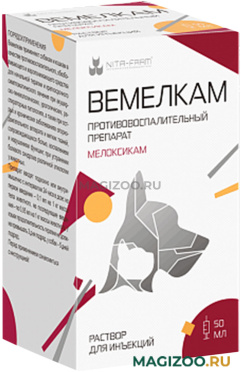 Вемелкам селективный нестероидный противовоспалительный препарат применяют собакам и кошкам в качестве противовоспалительного, обезболивающего и жаропонижающего средства. Ветеринарный инъекционный безболезненный препарат специально для кошек и собак на основе мелоксикама с удобной концентрацией.
