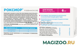РОКСИОР применяют кошкам в качестве противовоспалительного и болеутоляющего препарата при воспалительных и болевых синдромах различного происхождения, включая острые и хронические заболевания опорно-двигательного аппарата (артриты, артрозы, синовиты, вывихи), воспалительные заболевания мягких тканей, а также в качестве анальгезирующего и противовоспалительного препарата в послеоперационный период.
