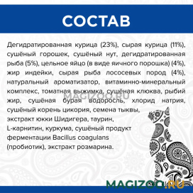 Дегидратированная курица – 23%, сырая курица – 11%, сушёный горошек, сушёный нут, дегидратированная рыба – 5%, цельное яйцо (в виде яичного порошка) – 4%, жир индейки, сырая рыба лососевых пород – 4%, натуральный ароматизатор, витаминно-минеральный комплекс, томатная выжимка, сушёная клюква, рыбий жир, сушёная бурая водоросль, хлорид натрия, сушёный корень цикория, семена тыквы, экстракт юкки Шидигера, таурин, L-карнитин, куркума, сушёный продукт ферментации Bacillus coagulans (пробиотик), экстракт розмарина.