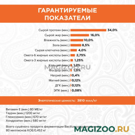 Высокое содержание Омега-3 жирных кислот. Отсутствие в составе злаков, глютена, ГМО, куриного мяса, красителей, консервантов, искусственных антиоксидантов и усилителей вкуса. |