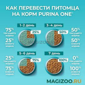 Переводите на новый корм постепенно: в течение 7 дней плавно переводите исходный рацион на корм Purina ONE®