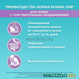Корм для кошек Purina ONE® (ПУРИНА УАН) — полнорационный корм, разработанный ветеринарами и диетологами Purina специально для взрослых питомцев с чувствительным пищеварением и разборчивым вкусом в еде.