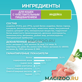 Состав товара:Индейка (17,5%), рис (17%), сухой белок индейки, белок гороха, кукуруза, растительная мука, животные жиры, высушенный корень цикория* (2%), минеральные вещества, гидролизат белка животного происхождения, дрожжи, консерванты, аминокислоты, витамины, рыбий жир, антиоксиданты.