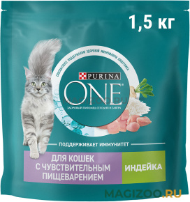 Корм Purina ONE® с индейкой для кошек с чувствительным пищеварением 1,5 кг — это: