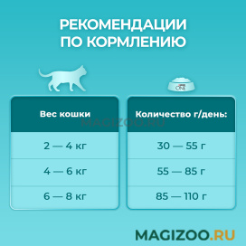 Рекомендации по кормлению: рекомендуемая суточная норма зависит от погодных условий, уровня активности кошки и ее физических особенностей. Следите, чтобы у кошки всегда была чистая, свежая питьевая вода без ограничений.