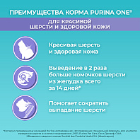 Корм для кошек Purina ONE® (ПУРИНА УАН) — полнорационный корм, разработанный ветеринарами и диетологами Purina специально для заботы о красивой шерсти и здоровой коже взрослых кошек.