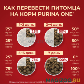 Если вы предлагаете собаке корм Purina ONE® впервые, рекомендуем переводить на новый корм постепенно. В течение 7 дней плавно заменяйте исходный рацион на корм Purina ONE®. Это позволит пищеварительной системе питомца лучше адаптироваться к изменению корма.