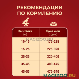 Рекомендации по кормлению:Рекомендуемая суточная норма зависит от погодных условий, уровня активности собаки и ее физических особенностей. Следите, чтобы у собаки всегда была чистая, свежая питьевая вода без ограничений.