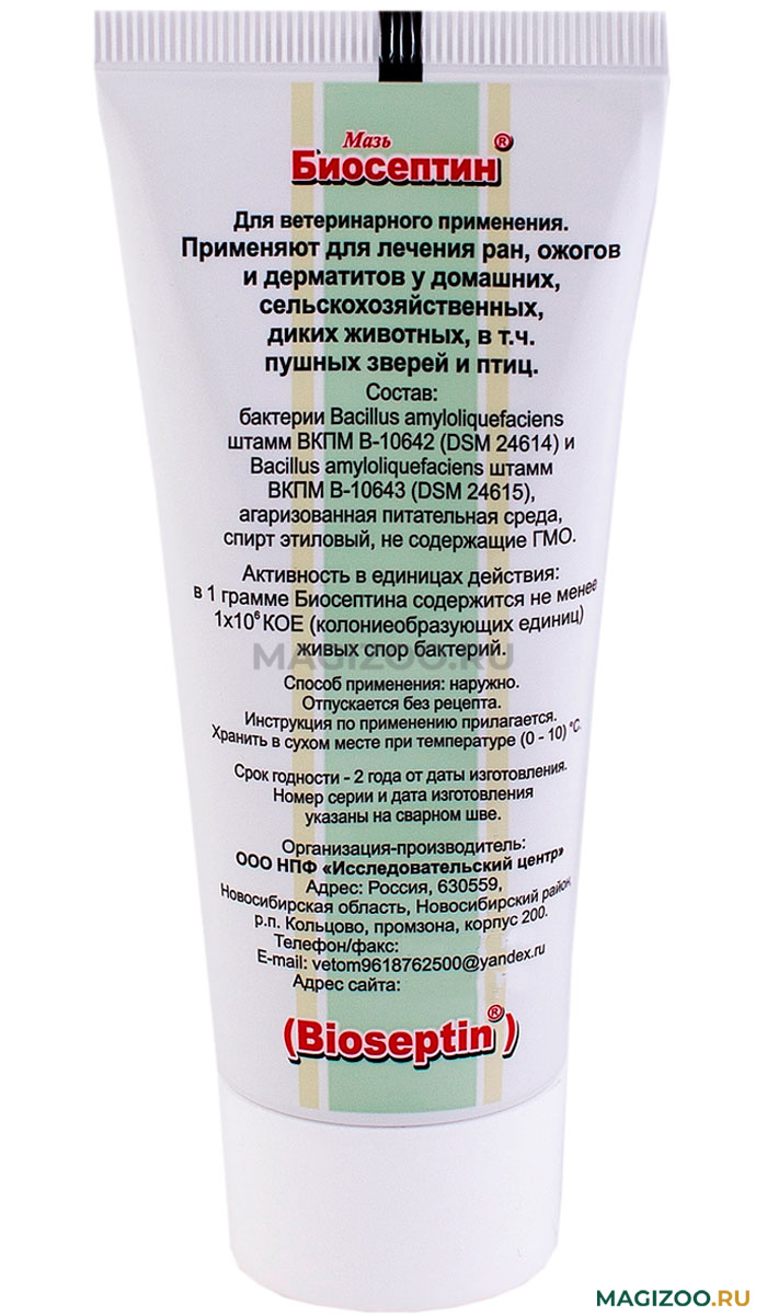 2. Лекарственная форма: мазь для наружного применения. Биосептин содержит бактерии Bacillus amyloliquefaciens штамм ВКПМ В-10642 (DSM 24614) и Bacillus amyloliquefaciens штамм ВКПМ В-10643 (DSM 24615), а также вспомогательные вещества - агаризованную питательную среду после выращивания этих бактерий и спирт этиловый.