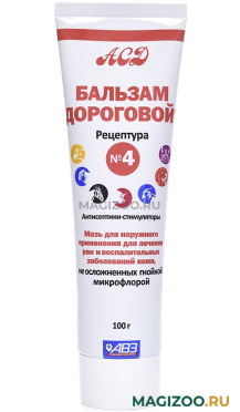 При лечении ран, язв, ожогов, потертостей, трещин, дерматитов и экзем разной этиологии негнойного характера Бальзам Дороговой № 4 наносят тонким слоем на пораженные участки кожи, равномерно распределяя по поверхности, 1-2 раза в день до выздоровления животного.