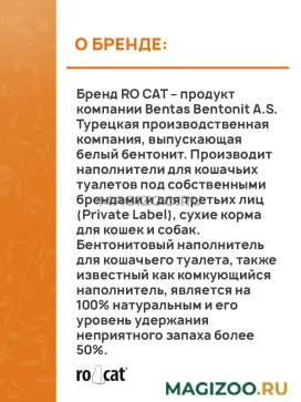 Наполнители RO CAT изготовлены по технологии нового поколения из натурального бентонитового рудника, обладают высокой запахопоглощающей способностью и идеальной скоростью флокуляции.