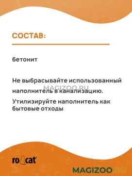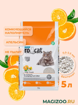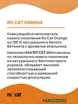 Комкующийся наполнитель нового поколения Ro Cat Orange из 100 % натурального белого бетонита с ароматом апельсина.