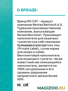 Наполнители RO CAT изготовлены по технологии нового поколения из натурального бентонитового рудника, обладают высокой запахопоглощающей способностью и идеальной скоростью флокуляции.