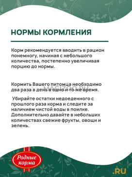 Рекомендации по кормлению: Корм рекомендуется вводить в рацион понемногу, начиная с небольшого количества, постепенно увеличивая порцию до нормы. Кормить Вашего питомца необходимо два раза в день в одно и то же время. Убирайте остатки недоеденного с прошлого раза корма и следите за наличием чистой воды в поилке. Дополнительно давайте в небольших количествах свежие фрукты, овощи и зелень.