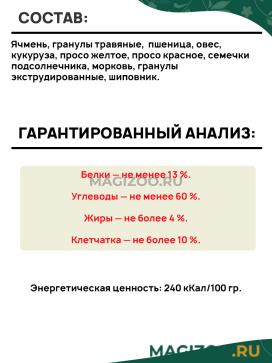 Состав: Ячмень, гранулы травяные, пшеница, овес, кукуруза, просо желтое, просо красное, семечки подсолнечника, морковь, гранулы экструдированные, шиповник.