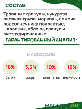 Состав: Травяные гранулы, кукуруза, овсяная крупа, морковь, семена подсолнечника полосатые, шиповник, яблоки, гранулы экструдированные.