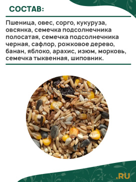 Пшеница, овес, сорго, кукуруза, овсянка, семечка подсолнечника полосатая, семечка подсолнечника черная, сафлор, рожковое дерево, банан, яблоко, арахис, изюм, морковь, семечка тыквенная, шиповник