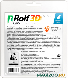 ФАРМАКОЛОГИЧЕСКИЕ СВОЙСТВА:Рольф Клуб 3D капли для кошек относятся к группе инсектоакарицидных препаратов. Фипронил, этофенпрокс и пирипроксифен, входящие в состав препарата, оказывают контактное инсектоакаридидное действие на половозрелых и неполовозрелых (личинки) фаз развития блох, власоедов, нотоэдрозных, отодекозных и иксодовых клещей, паразитирующих на кошках, а также обеспечивает защиту животных от кровососущих летающих насекомых (комаров, мошек и москитов). Препарат Рольф клуб 3D капли для кошек обладает выраженным нокдаун-эффектом, время наступления состояния нокдауна составляет около 2-х минут, что препятствует присасыванию (укусу) клещей и насекомых при нападении. Оказывает репеллентное действие на кровососущих летающих насекомых. Механизм действия фипронила заключается в нарушении прохождения ионов хлора в ГАМК-зависимых рецепторах эктопаразита, нарушении передачи нервных импульсов и деятельности нервной системы, что приводит к параличу и гибели членистоногих. Механизм действия этофенпрокса заключается в блокировании передачи нервных импульсов насекомых, что вызывает нарушение координации движений, паралич и гибель эктопаразитов, возникающий при первом контакте с шерстью обработанного животного. Этофенпрокс обладает быстрым нокдаун-эффектом на насекомых и иксодовых клещей, возникающий при первом контакте с шерстью обработанного животного. Механизм действия пирипроксифена заключается в нарушении процессов синтеза хитина и линьки личинок, препятствует развитию полноценных куколок и вызывает гибель насекомых на преимагинальных фазах развития, что приводит к прекращению восполнения популяции эктопаразитов. После нанесения препарата на кожу его активные компоненты равномерно распределяются по поверхности тела, не всасываясь в системный кровоток, накапливаются в эпидермисе, волосяных луковицах и сальных железах животного и оказывают длительное инсекто-акарицидное действие и защиту животного от насекомых и клещей. Рольф Клуб 3D по степени воздействия на организм кошек относится к умеренно опасным веществам (3 класс опасности по ГОСТ 12.1.007-76), не обладают местно-раздражающим и сенсибилизирующим действием. Препарат токсичен для кроликов, пчел, рыб и других гидробионтов, при попадании в глаза вызывает слабое раздражение.