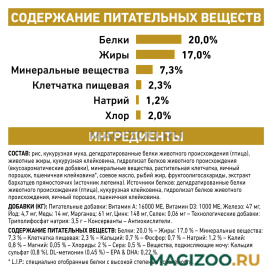 Рис, кукурузная мука, дегидратированные белки животного происхождения (птица), животные жиры, кукурузная клейковина, гидролизат белков животного происхождения (вкусоароматические добавки), минеральные вещества, растительная клетчатка, яичный порошок, пшеничная клейковина*, соевое масло, рыбий жир, фруктоолигосахариды, экстракт бархатцев прямостоячих (источник лютеина). Источники белков: дегидратированные белки животного происхождения (птица), кукурузная клейковина, гидролизат белков животного происхождения, яичный порошок, пшеничная клейковина.