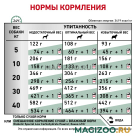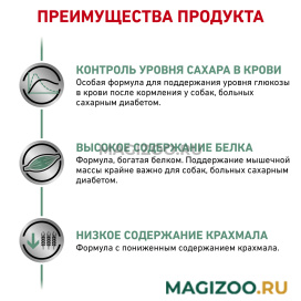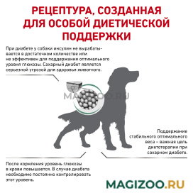 Данный корм рекомендуется для постоянного применения собакам, страдающим сахарным диабетом, на протяжении всей жизни.