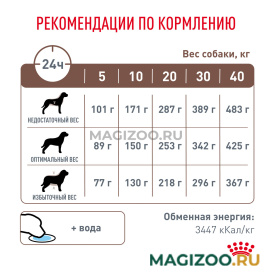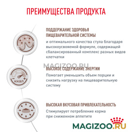 Полнорационный диетический корм для собак, рекомендуемый при острых расстройствах пищеварения, в реабилитационный период и при истощении. Легкоусвояемые ингредиенты. Дополнительное количество электролитов и высокое содержание основных питательных веществ. Высокая калорийность.