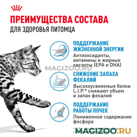 - Оптимальное пищеварение и снижение запаха стула. Содержит белки с высокой усвояемостью (L.I.P.), оптимальный процент клетчатки и специальный комплекс питательных веществ, стимулирующих пищеварение и способствующих снижению объема и запаха фекалий. *L.I.P.: специально отобранные белки с высокой степенью усвояемости.
