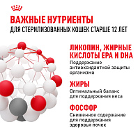 Специальный комплекс питательных веществ, содержащийся в рационе ROYAL CANIN® Ageing Sterilised 12+, и включающий комбинацию антиоксидантов (в т.ч. ликопин), триптофан и жирные кислоты Омега-3, помогает замедлять процессы старения и поддерживает активность кошек в пожилом возрасте.