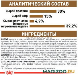 Злаки, изолят растительных белков*, растительная клетчатка, рис, дегидратированные белки животного происхождения (птица), животные жиры, гидролизат белков животного происхождения (вкусоароматические добавки), минеральные вещества, рыбий жир, соевое масло, томатный порошок (источник ликопена), дрожжи и побочные продукты брожения, оболочка семян подорожника, фруктоолигосахариды, гидролизат дрожжей (источник мaннановых олигосахаридов), глюкозамина гидрохлорид, масло огуречника аптечного, экстракт бархатцев прямостоячих (источник лютеина), гидролизат из хряща (источник хондроитина).