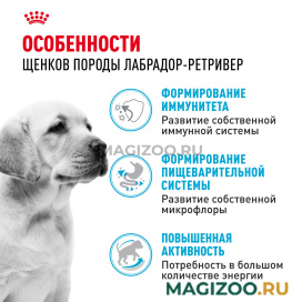 Благодаря специально адаптированной энергетической ценности, сбалансированному содержанию белка, кальция и фосфора, Royal CANIN® Labrador Retriever Puppy способствует оптимальному развитию скелете. Продукт способствует гармоничному набору веса, чтобы помочь вашему щенку поддерживать оптимальный вес по мере его роста.