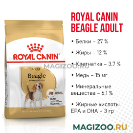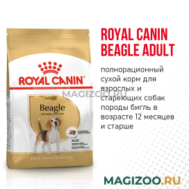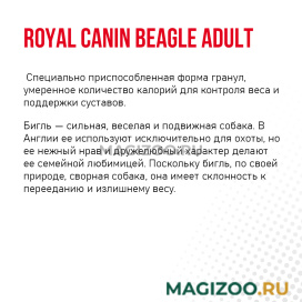 Полнорационный сухой корм для взрослых и стареющих собак породы бигль в возрасте 12 месяцев и старше. Специально приспособленная форма гранул, умеренное количество калорий для контроля веса и поддержки суставов.